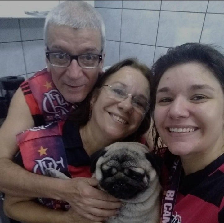 One came from the family, from generation to generation. My grandparents passed this passion on to my father, who passed it on to me. Football. In my case: Clube de Regatas Flamengo. My favourite team. Yes, I'm passionate about this sport and this team. My father taught me to love both from a young age. We used to go to the Maracanã and watch the games together on TV at home. It's a family love. My mum and sister have this love, but it's not the same passion.